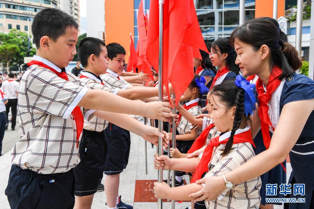 當(dāng)日,廣西南寧市濱湖路小學(xué)舉行“紅領(lǐng)巾心向黨 爭做新時(shí)代好隊(duì)員”為主題的少先隊(duì)員入隊(duì)儀式,一年級學(xué)生在“六一”前戴上紅領(lǐng)巾,光榮加入中國少年先鋒隊(duì)?!?/p>