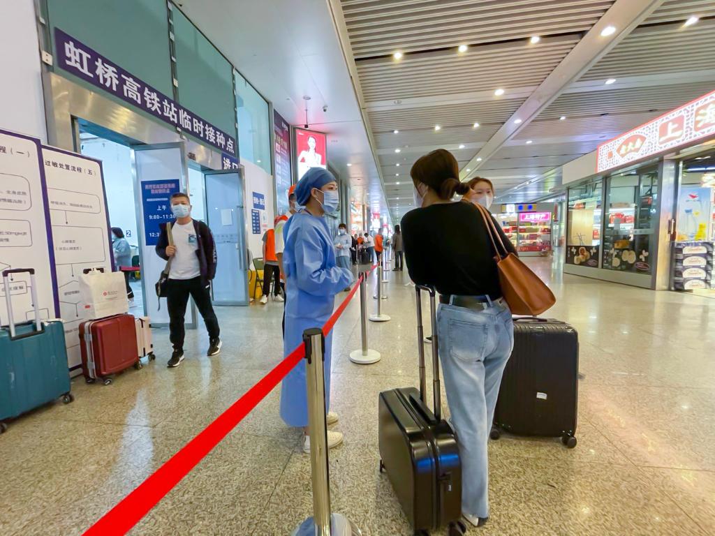 2021年5月29日,上海,旅客在上海虹橋火車站臨時疫苗接種點向醫(yī)務(wù)人員咨詢。新華社記者 黃安琪 攝