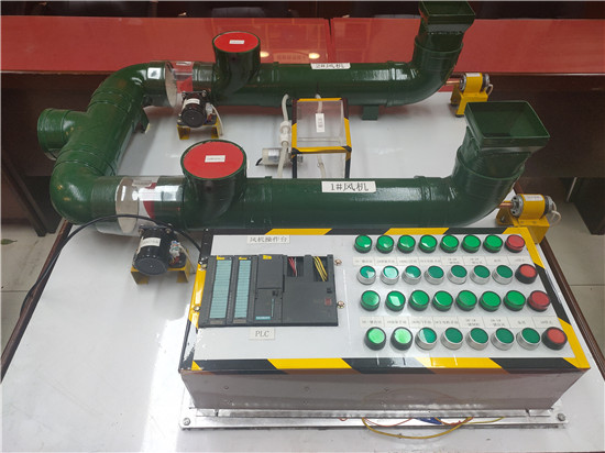 該模型由監(jiān)控系統(tǒng)和風(fēng)機(jī)主體兩部分構(gòu)成,監(jiān)控系統(tǒng)由PLC柜中的S7-300PLC模塊及電腦組成,風(fēng)機(jī)主體利用PVC管材制作的風(fēng)筒以及小電機(jī)組成。不僅可滿足實(shí)操培訓(xùn)教學(xué),同時還可進(jìn)行模擬故障情況下的倒機(jī)操作,能有效提高主扇司機(jī)的操作技能,為公司礦井通風(fēng)系統(tǒng)的安全穩(wěn)定運(yùn)行多了一層保障。