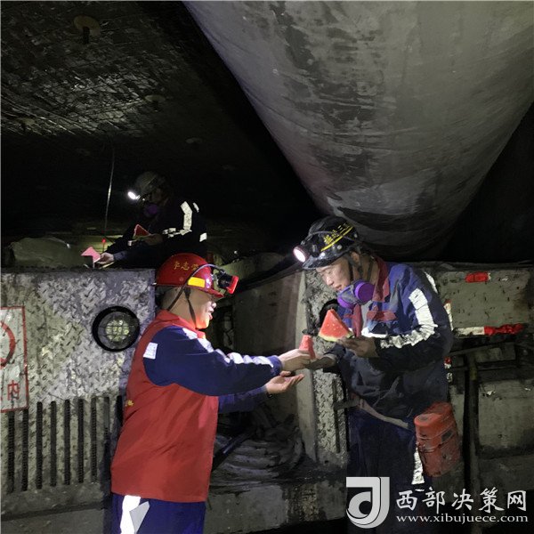 干了一上午活大家都累了吧,都來歇息一下,吃塊西瓜”在進風巷,掘進三工區(qū)黨支部書記李志榮帶著可口的飯菜和一顆西瓜親臨一線慰問每個工人。
