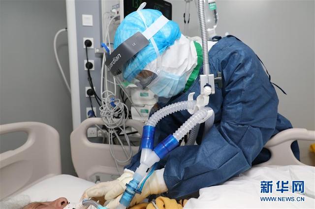 海軍軍醫(yī)大學第二附屬醫(yī)院急診、重癥醫(yī)學科護士長陳靜在武漢火神山醫(yī)院為患者進行氣管插管后的導(dǎo)管固定(2月19日攝)。新華社發(fā)(陳晨 攝)