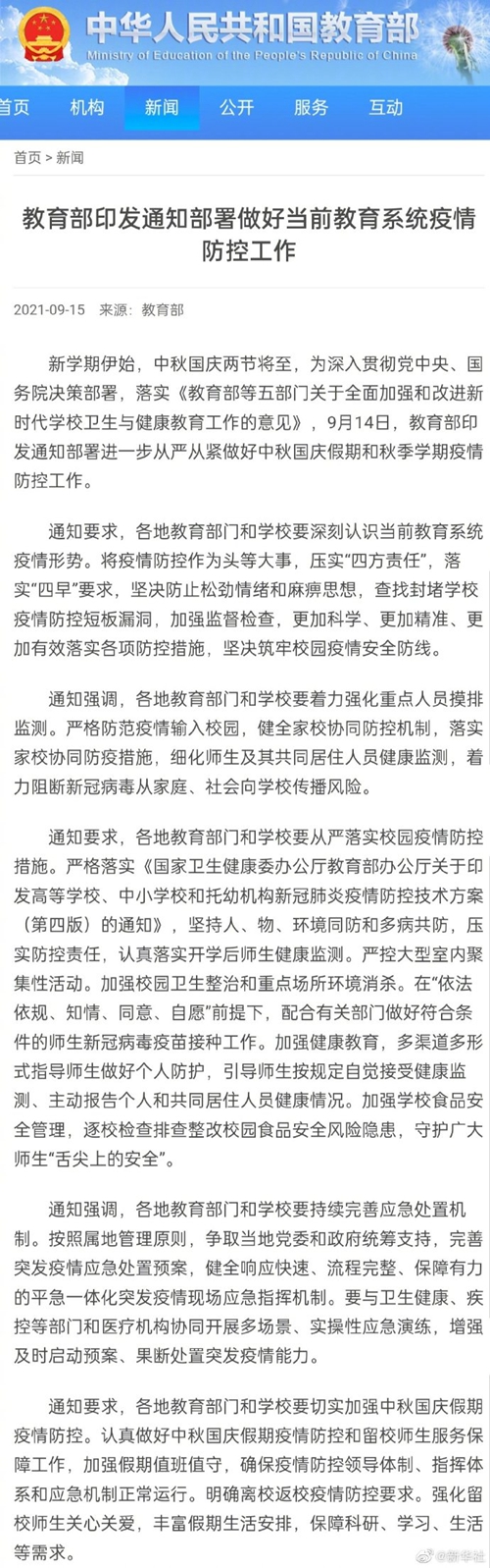 記者15日從教育部獲悉,教育部日前印發(fā)通知部署進(jìn)一步從嚴(yán)從緊做好中秋國慶假期和秋季學(xué)期疫情防控工作。通知要求,各地教育部門和學(xué)校要將疫情防控作為頭等大事,查找封堵學(xué)校疫情防控短板漏洞,健全家校協(xié)同防控機(jī)制,細(xì)化師生及其共同居住人員健康監(jiān)測,著力阻斷新冠病毒從家庭、社會向?qū)W校傳播風(fēng)險。通知要求,各地教育部門和學(xué)校要做好中秋國慶假期疫情防控和留校師生服務(wù)保障工作,加強(qiáng)假期值班值守,確保疫情防控領(lǐng)導(dǎo)體制、指揮體系和應(yīng)急機(jī)制正常運(yùn)行。(記者余俊杰)