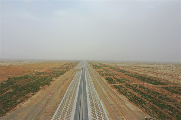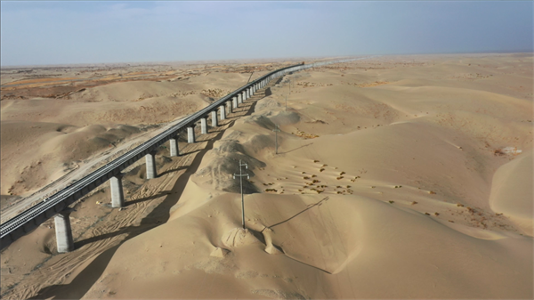 和若鐵路為國家重點(diǎn)鐵路建設(shè)項(xiàng)目,線路全長825.476公里,2018年12月開工建設(shè),連通南疆和田地區(qū)和田市與巴音郭楞蒙古自治州若羌縣。完成鋪軌的和若鐵路與現(xiàn)有格庫鐵路、喀和鐵路、南疆鐵路連通,環(huán)繞塔克拉瑪干沙漠一周,構(gòu)成世界首條環(huán)沙漠鐵路線。