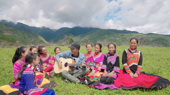 路面因為剛剛下過的雨水變得有些泥濘,走了約半小時的山路后,鄉(xiāng)村教師吉布小龍帶著合唱團的“妞妞們”坐在山頂草坪上。他用吉他伴奏,9個女孩圍著他放聲歌唱:“不懼密林深處的豺狼,敢于深海淺灘與蛇蝎作伴……”不遠處的青山峰巒起伏,山頂上云霧徜徉。