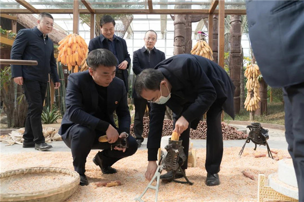 在上古農耕文化、現(xiàn)代農業(yè)科技與地方特色農業(yè)相結合的神農百草園里,高廳長饒有興趣的親自體驗農事活動的玉米脫粒。調研組一行還參觀了各項高科技栽培種植及研學課堂區(qū)域。