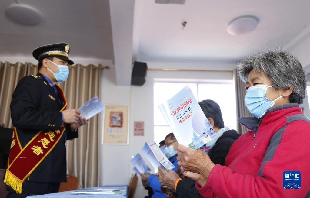 12月4日,在河北省邢臺市襄都區(qū)東郭村鎮(zhèn)南康莊村,普法志愿者在給村民進(jìn)行普法宣傳。新華社發(fā)(張馳 攝)