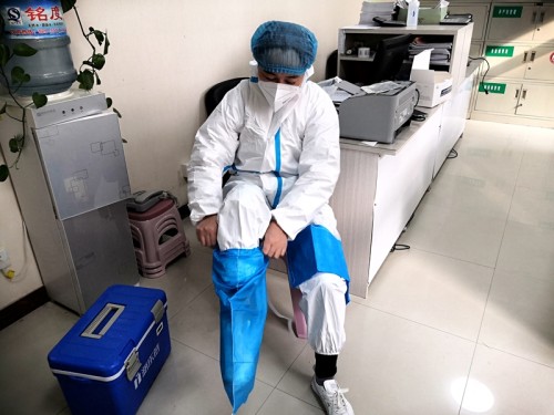 采完最后一戶,王敏娟下樓時眼前突然發(fā)黑,直接暈倒摔了一跤。同事急忙攙扶起她,在原地休息了十分鐘左右,人才緩過來。王敏娟感覺右腿疼的動不了,就給她同在一個單位的丈夫打電話,但是丈夫也在一線為住院病人采集核酸樣本,不能離開。