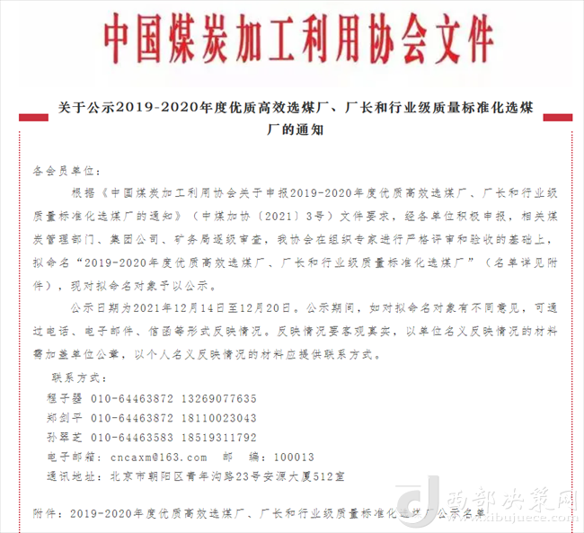 西部決策網(wǎng)訊12月14日,從中國煤炭加工利用協(xié)會傳來喜訊,陜煤集團(tuán)陜北礦業(yè)檸條塔公司選煤廠榮獲2019-2020年度行業(yè)級質(zhì)量標(biāo)準(zhǔn)化選煤廠。