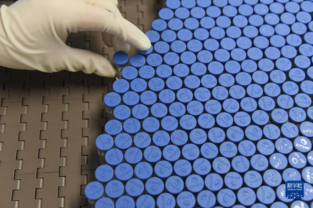 在安徽智飛龍科馬生物制藥有限公司新冠疫苗生產(chǎn)線上,工作人員對疫苗進行人工檢測(5月20日攝)。新華社記者 黃博涵 攝
