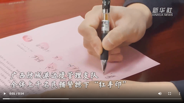 廣西防城港邊境管理支隊上千名民輔警集體遞交“戰(zhàn)疫請戰(zhàn)書”,主動要求向抗疫最前線靠攏。他們繼續(xù)選擇逆行,奔赴國門口岸、邊境卡口、村寨社區(qū),始終奮戰(zhàn)在最前線,維護檢測現(xiàn)場秩序,保障救援力量通行,強化邊境巡邏防控。“請戰(zhàn)書”上的一個個“紅手印”,見證忠誠。