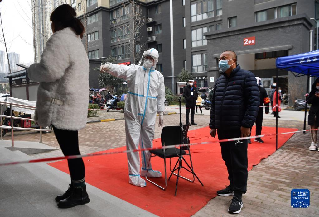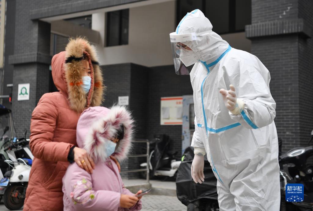 12月27日,在西安市雁塔區(qū)孟村小區(qū),盧晨陽(左二)引導(dǎo)居民進行核酸檢測。新華社記者 張博文 攝