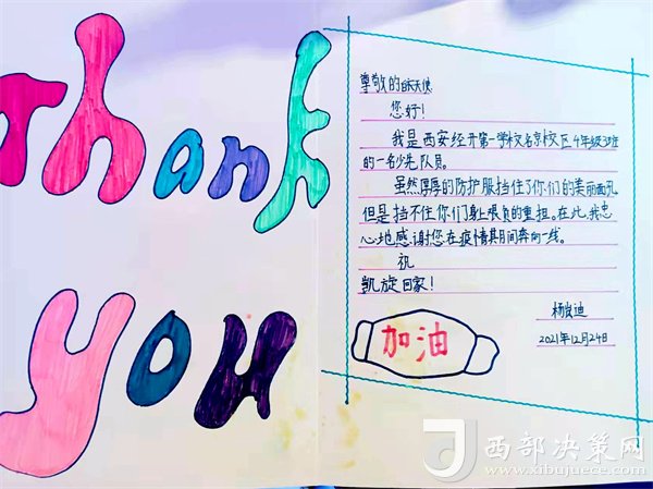三九嚴(yán)冬,雪花紛飛,寒風(fēng)刺骨。12月24日,一大早,我和隊(duì)員們?cè)缭绲街付ǖ攸c(diǎn)集合,等待分配任務(wù)??吹阶o(hù)理姐妹們個(gè)個(gè)兒都精神飽滿、整裝待發(fā),我的心情是又緊張又激動(dòng)。當(dāng)我們到達(dá)任務(wù)采集地點(diǎn)時(shí),社區(qū)工作人員和志愿者同志為我們搭建了一個(gè)簡(jiǎn)易帳篷。帳篷四翼隨風(fēng)飄揚(yáng),凜冽的寒風(fēng)襲進(jìn)帳篷,如同置身風(fēng)口一樣。一切準(zhǔn)備就緒,換上防護(hù)用品,立即開展工作。室外溫度達(dá)零下五度,我們認(rèn)真地為每位居民采集核酸。采集完核酸后,做到一人一消,隊(duì)員的手都凍得通紅麻木,已經(jīng)感覺(jué)不到疼痛,面屏上都已經(jīng)霧氣籠罩,但是,隊(duì)員們沒(méi)有一個(gè)人喊累、沒(méi)有一個(gè)人退縮,更沒(méi)有一個(gè)人喊停。這時(shí),耳畔傳來(lái)一聲,“孩子,辛苦了,這是我給你們送的熱水,” “我家有熱寶,給你們?nèi)∪∨?rdquo;“姐姐,謝謝你們,”說(shuō)著,一個(gè)小女孩走過(guò)來(lái),送來(lái)兩張自己做的小賀卡,上面寫的都是感謝的話語(yǔ)。