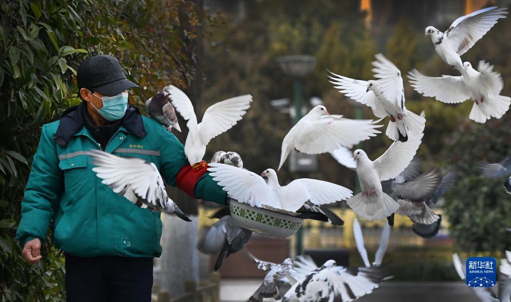 12月28日,在西安市新城廣場,工作人員給廣場鴿喂食。新華社記者 陶明 攝