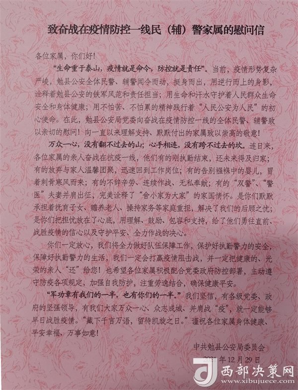 西部決策網(wǎng)訊為表達(dá)對(duì)奮戰(zhàn)在疫情防控一線民輔警家屬的崇高敬意,感謝他們對(duì)公安工作的理解和支持,12月29日下午,勉縣公安局組織開(kāi)展疫情防控一線民輔警家屬慰問(wèn)活動(dòng),為家屬們送去慰問(wèn)信和慰問(wèn)品,并通過(guò)他們向奮戰(zhàn)在一線的民輔警傳遞勉縣公安局黨委的溫暖和關(guān)愛(ài),以更加飽滿的熱情、昂揚(yáng)的斗志投入到疫情防控工作中。