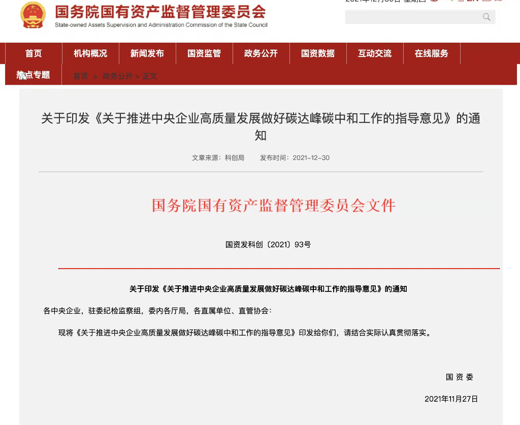 國務院國資委30日對外發(fā)布《關(guān)于推進中央企業(yè)高質(zhì)量發(fā)展做好碳達峰碳中和工作的指導意見》,明確了中央企業(yè)做好碳達峰碳中和工作的總體要求與主要目標。