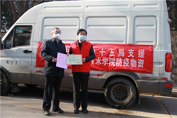 1月11日下午15:00,在陜西職業(yè)技術(shù)學(xué)院舉行簡短捐贈儀式,陜西職業(yè)技術(shù)學(xué)院黨委副書記、院長劉勝輝,黨委副書記、紀委書記何軍,副院長王慶等參加了捐贈儀式。劉勝輝代表學(xué)院黨委向我公司表示感謝,他表示,在疫情防控的關(guān)鍵時刻,水電十五局一周內(nèi)2批次送來價值近28萬元生活物資,及時緩解更極大充實和豐富了我??挂呱钗镔Y,為我院師生樹立了光輝榜樣,堅定了共克時艱的信心和決心。何軍向公司黨委副書記、紀委書記、工會主席任志宏贈送了捐款證明和感謝信。任志宏表示,水電十五局作為駐陜央企,一直以來,堅決貫徹落實黨中央決策部署,主動響應(yīng)陜西省委組織部和省國資委號召,面對此次疫情,將積極踐行央企擔當,履行社會責(zé)任,用實際行動為西安高校疫情防控貢獻一份力量!