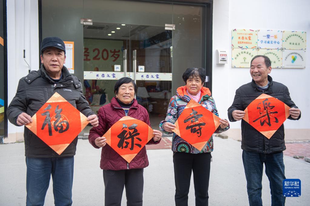 1月18日,江北區(qū)桃源小區(qū)的居民拿著寫好的字在“長者之家”門口合影。該小區(qū)老年人居住比例較高,在老舊小區(qū)改造過程中,街道將小區(qū)內(nèi)閑置用房改造成集老年大學(xué)、幼兒托管等為一體的“長者之家”。新華社記者 江漢 攝