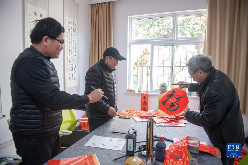 1月18日,江北區(qū)桃源小區(qū)的居民在“長者之家”寫“福”字。該小區(qū)老年人居住比例較高,在老舊小區(qū)改造過程中,街道將小區(qū)內(nèi)閑置用房改造成集老年大學(xué)、幼兒托管等為一體的“長者之家”。新華社記者 江漢 攝