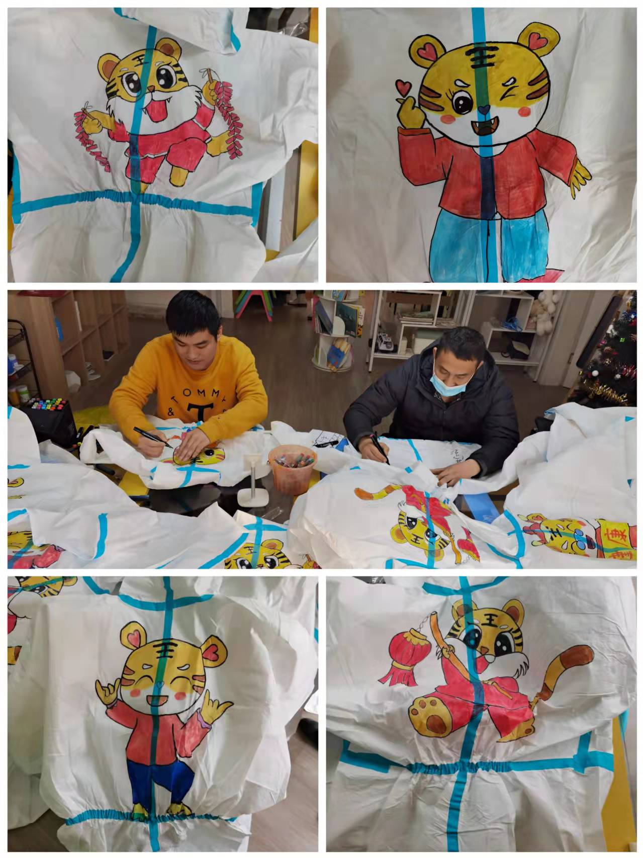 憨態(tài)可掬的小老虎,有的瞇縫著眼睛,有的張開嘴巴,有的捧著鞭炮,有的打著燈籠,還有的雙手捧“福”到家……這些五彩繽紛的圖案,出現(xiàn)在雁塔區(qū)杜城街道中鐵尚都城社區(qū)一批志愿者的防護服上,引人注目。