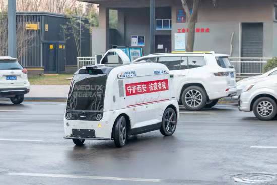 這輛憨態(tài)可掬的白色小車,便是航天基地轄區(qū)企業(yè)——新石器交叉信息核心技術(shù)研究院(西安)有限公司運營的新石器無人車。為了減輕封控管理小區(qū)物資保障壓力,1月10日,在航天基地與該公司的密切配合下,新石器無人車在航天基地正式上崗,打通了便利店到社區(qū)配送的“最后一米”。