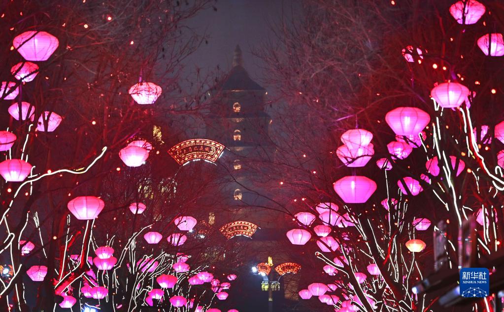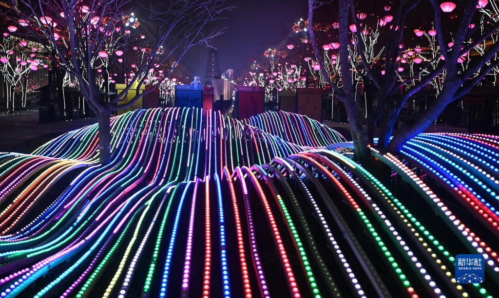 春節(jié)臨近,西安市大唐不夜城點亮璀璨奪目的燈光,迎接新春佳節(jié)的到來?!?/p>