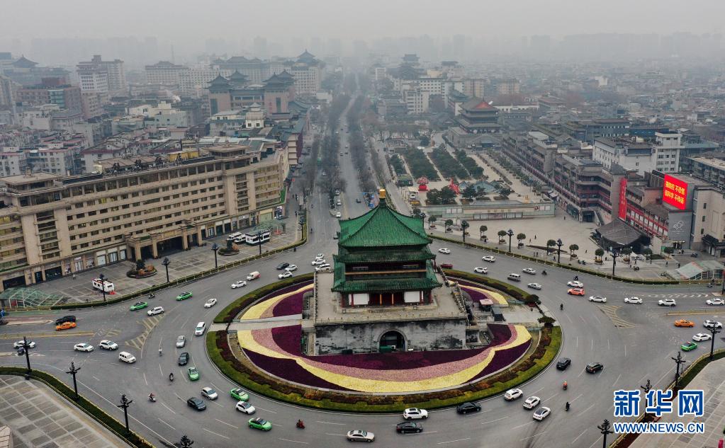 1月22日,西安市鐘樓盤道再現(xiàn)車水馬龍的景象(無人機(jī)照片)。新華社記者 陶明 攝