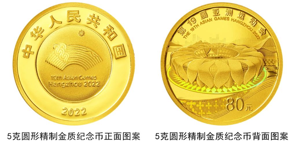 該套金銀紀念幣正面圖案均為第19屆亞洲運動會會徽,并刊國名、年號。5克圓形金質紀念幣背面圖案為杭州奧林匹克體育中心體育場,輔以城市建筑、山水、桂花等元素裝飾組合設計,并刊“第19屆亞洲運動會”等字樣。該紀念幣含純金5克,最大發(fā)行量1萬枚。