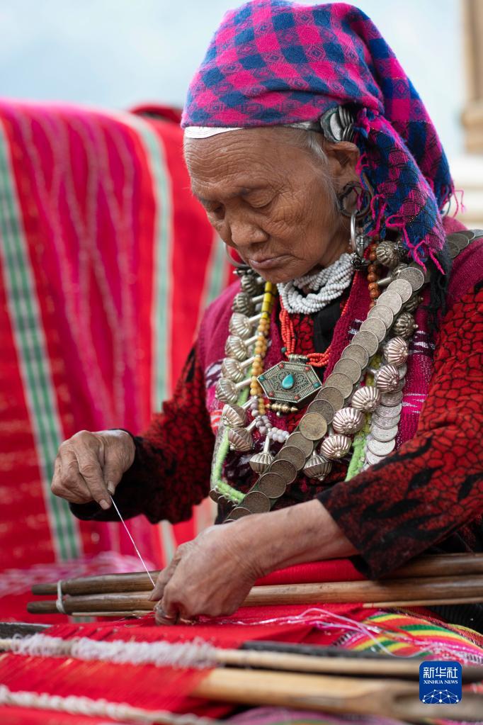 今年72歲的本央老人,是僜人服飾制作技藝西藏自治區(qū)級(jí)非遺傳承人。在西藏林芝市察隅縣沙瓊村,老人身著傳統(tǒng)的僜人服飾,在自家的涼亭里編織布料。