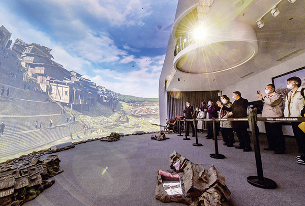 圖為在重慶紅巖革命紀(jì)念館“紅巖記憶”數(shù)字體驗(yàn)廳內(nèi),觀(guān)眾們觀(guān)看以雙曲三維穹幕技術(shù)展示的場(chǎng)景。 新華社記者 李賀/攝