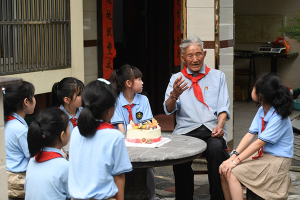 2020年6月28日,浙江省湖州市吳興區(qū)八里店鎮(zhèn)組織小學(xué)生開(kāi)展“童心向黨”主題繪畫(huà)、聆聽(tīng)老黨員講故事、參觀(guān)紅色教育基地等活動(dòng)。圖為吳興區(qū)第一小學(xué)學(xué)生聆聽(tīng)八里店鎮(zhèn)前村村老黨員陳金茂(右二)講故事。新華社記者 黃宗治/攝