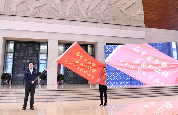 2021年1月18日,在北京國(guó)家博物館,記者代表展示“奮斗百年路 啟航新征程”大型主題采訪(fǎng)活動(dòng)旗幟。新華社記者 申宏/攝