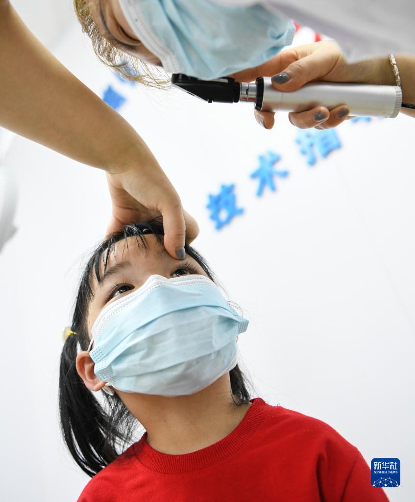 6月5日,在浙江省湖州市德清縣武康街道新豐未來社區(qū),醫(yī)務人員為社區(qū)兒童檢查視力。新華社發(fā)(謝尚國 攝)