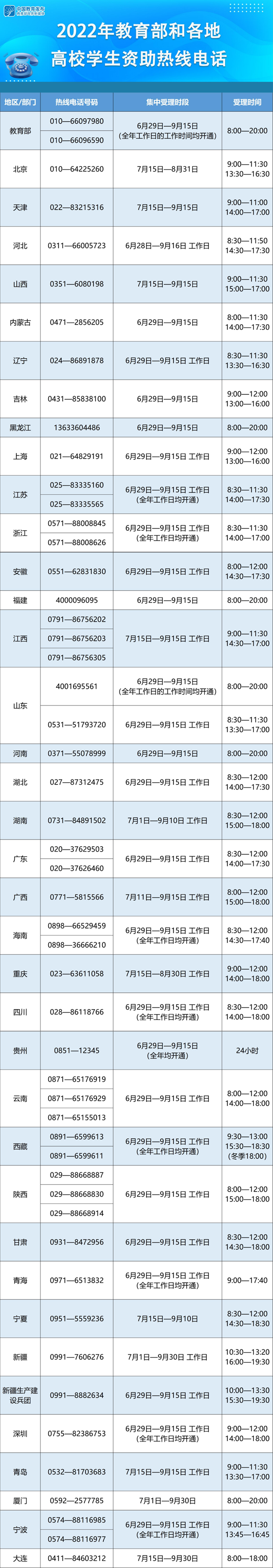 教育部要求各省(區(qū)、市)及所屬高校、中央高校學(xué)生資助管理部門(mén)均開(kāi)通熱線(xiàn)電話(huà),并結(jié)合實(shí)際情況自行確定集中受理時(shí)段和具體受理時(shí)間。
