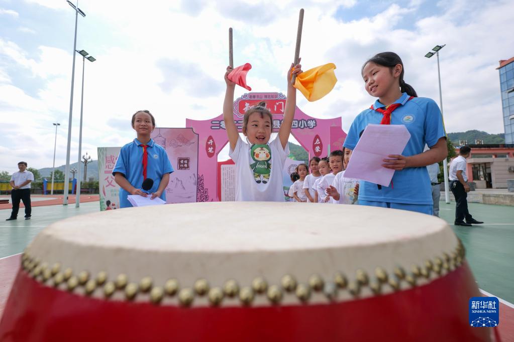 9月1日,貴州省黔東南苗族侗族自治州岑鞏縣第四小學的學生在“開筆禮”儀式上擊鼓許愿。新華社發(fā)(楊云 攝)