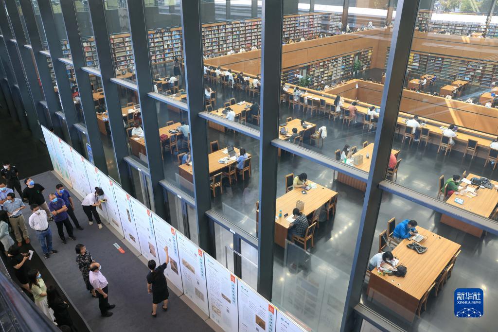 在北京國(guó)家圖書館,工作人員在介紹“經(jīng)典,予生活以詩意——‘文津經(jīng)典誦讀’十周年主題展”(2022年9月7日攝)。新華社記者 殷剛 攝