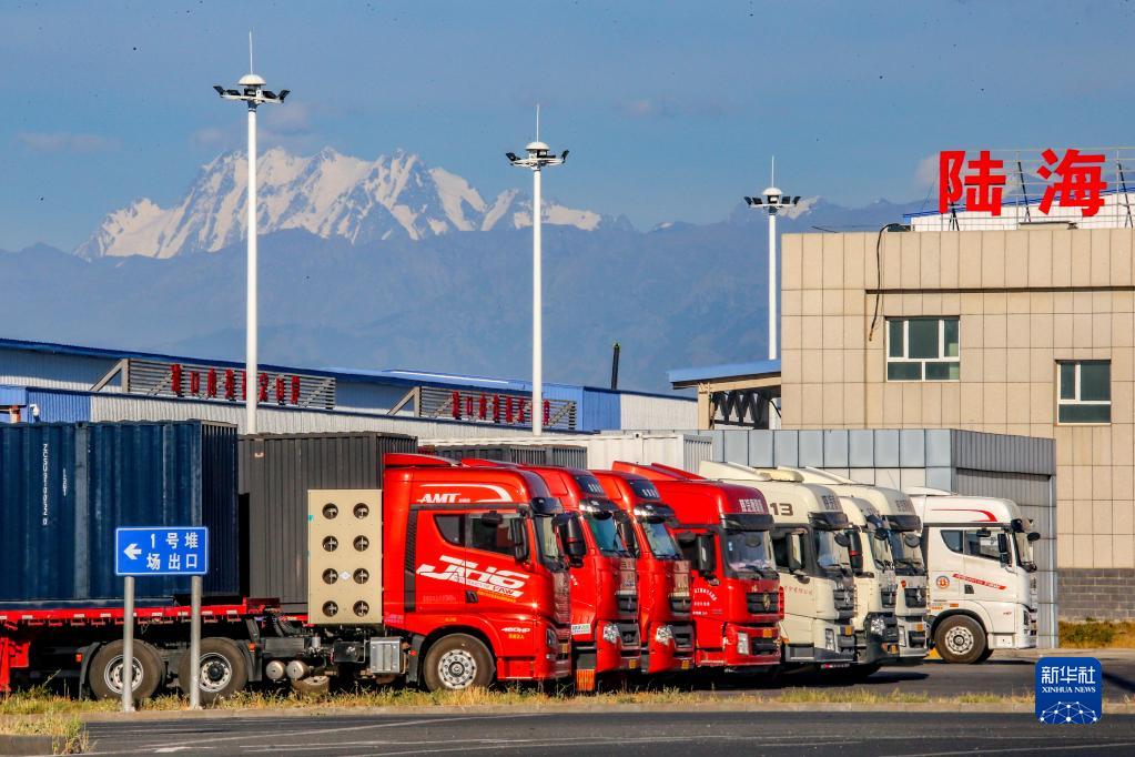 貨運(yùn)卡車(chē)在烏魯木齊國(guó)際陸港區(qū)排隊(duì)等待檢驗(yàn)(2022年7月14日攝)。新華社發(fā)(蔡增樂(lè) 攝)