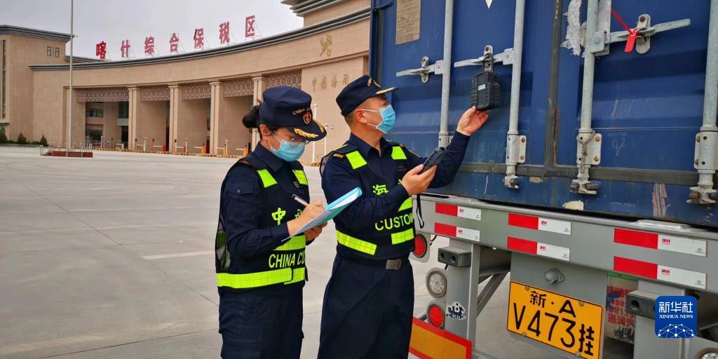 海關(guān)現(xiàn)場(chǎng)關(guān)員在喀什綜合保稅區(qū)登記入?yún)^(qū)車(chē)輛電子鎖信息(2022年9月14日攝)。新華社發(fā)(圖爾罕·麥麥提伊敏 攝)
