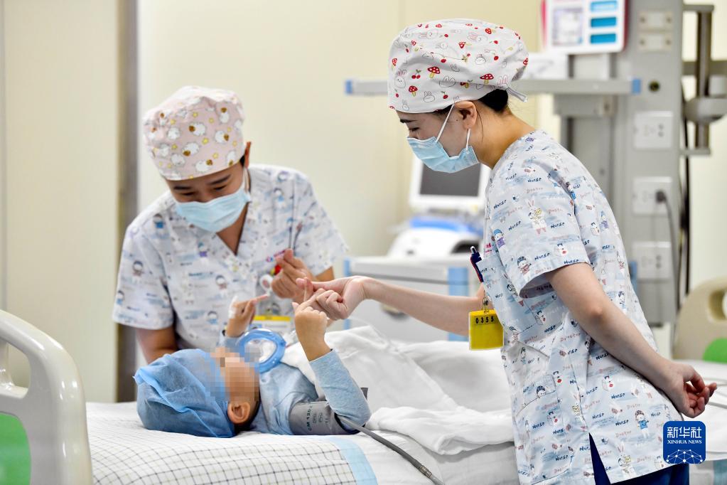 在山東省棗莊市婦幼保健院兒童ICU病房,醫(yī)護(hù)人員為完成靶向治療藥物諾西那生鈉的4歲脊髓性肌萎縮癥患兒加油鼓勁(2022年1月1日攝)。諾西那生鈉注射液是我國首個(gè)獲批治療脊髓性肌萎縮癥的進(jìn)口藥物,2019年進(jìn)入中國市場時(shí),每針價(jià)格近70萬元。在2021年國家醫(yī)保目錄藥品談判中,以3.3萬元每針的價(jià)格進(jìn)入新版醫(yī)保藥品目錄。新華社記者 郭緒雷 攝
