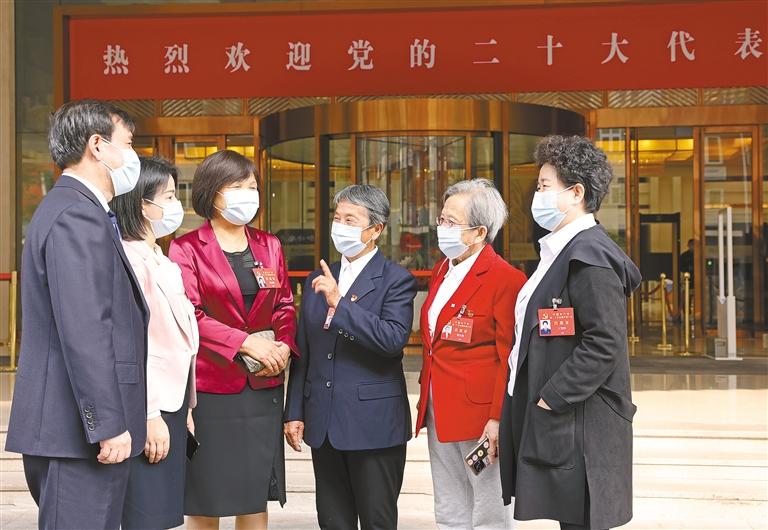 十月十四日,出席黨的二十大的陜西代表王友民、何菲、常亞瓊、張蓮蓮、路生梅、王照輝(左起)在住地交流履職感想。代表們一致表示,將堅決扛起政治責任,以飽滿的熱情認真履行好神圣職責。 記者 母家亮攝