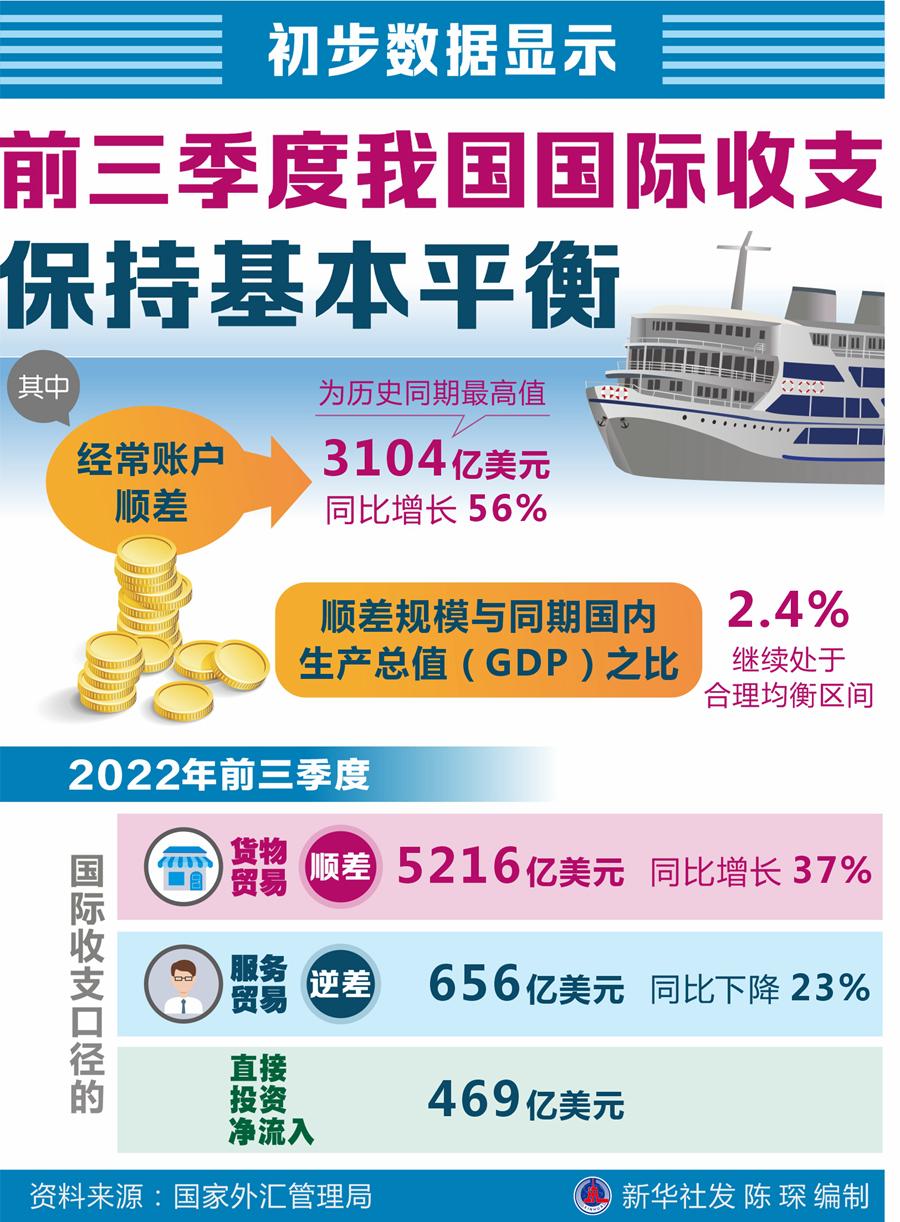 國家外匯管理局4日發(fā)布國際收支平衡表初步數(shù)據(jù)顯示,2022年前三季度,我國國際收支保持基本平衡。