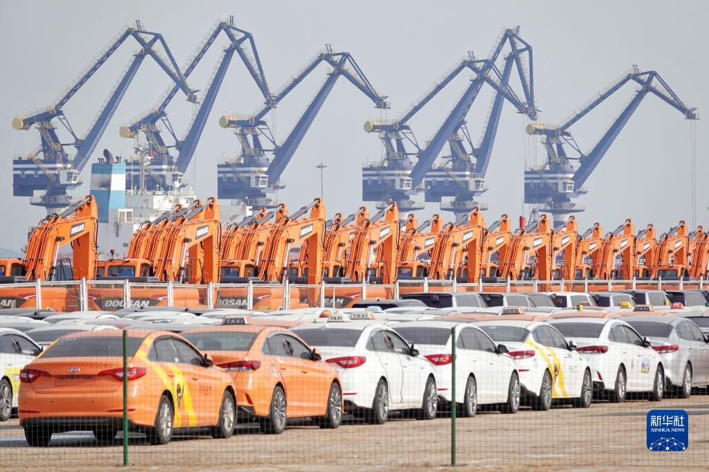1月17日,在山東港口煙臺港,起重機(jī)為貨輪裝卸貨物。新華社發(fā)(唐克 攝)