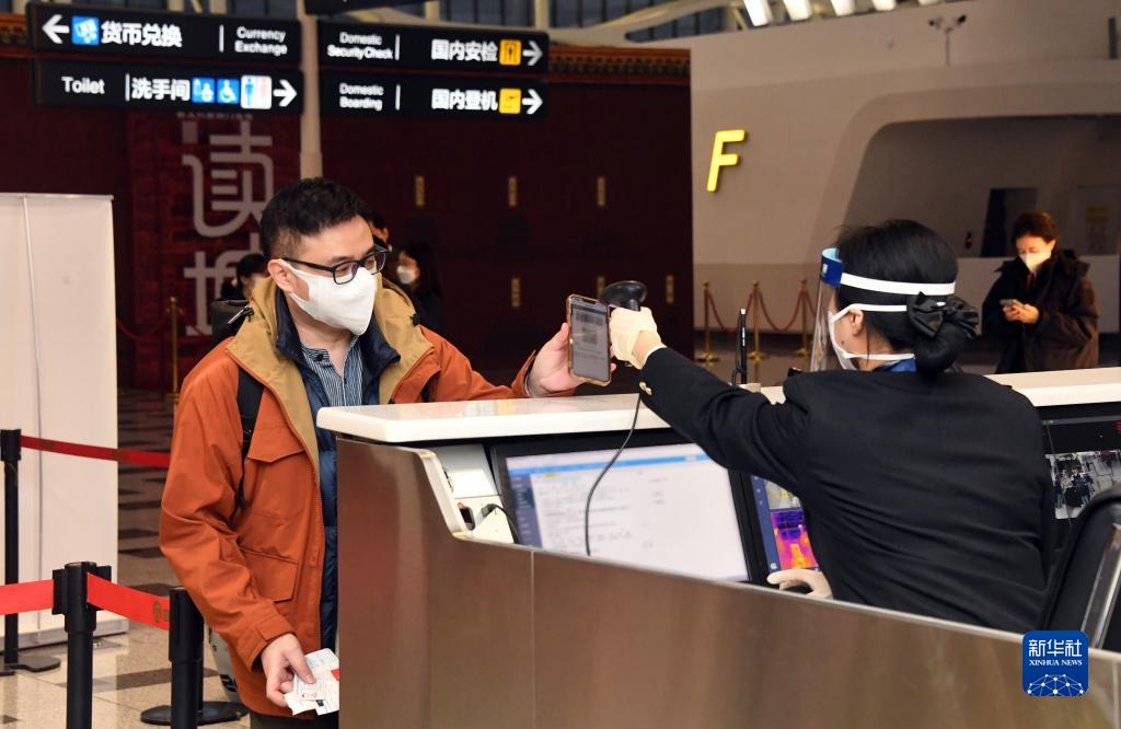 1月17日,在北京大興機(jī)場,海關(guān)關(guān)員核驗乘坐CZ309次北京飛往香港航班旅客的海關(guān)健康申報二維碼。新華社記者 任超 攝