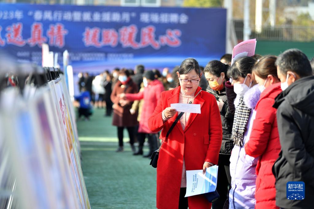 1月31日,求職者在湖北省襄陽市??悼h2023年春風行動暨就業(yè)援助月現(xiàn)場招聘會上了解崗位信息。新華社發(fā)(楊韜攝)