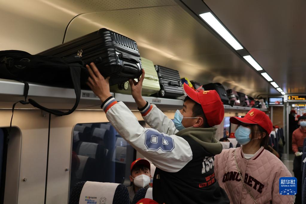 1月30日,旅客在D2879次務工專列上放行李。這是2023年貴陽開出的首趟高鐵務工專列。新華社記者 劉續(xù) 攝