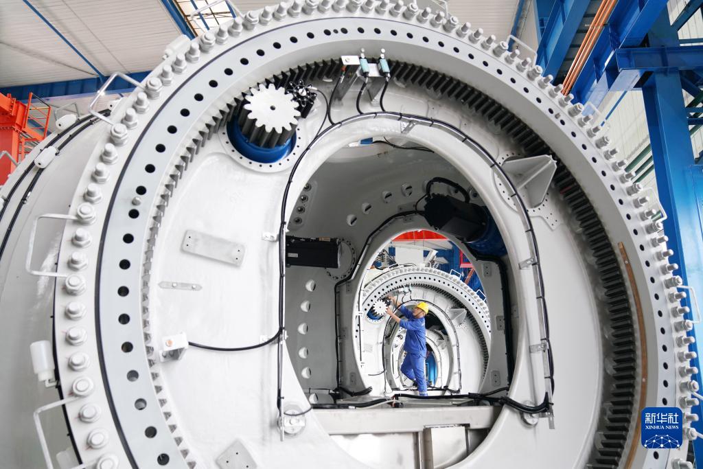 在黑龍江省齊齊哈爾市中國一重集團有限公司風(fēng)電裝備生產(chǎn)制造廠生產(chǎn)車間,工人進行生產(chǎn)作業(yè)(2021年7月1日攝)。新華社記者 王建威 攝