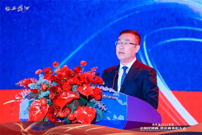 西鳳集團(tuán)公司黨委副書記郭拴新致祝酒辭,感謝參會經(jīng)銷商和一直以來給予西鳳大力支持的各界朋友,希望與大家攜手共進(jìn)、并肩同行,共同開創(chuàng)西鳳事業(yè)高質(zhì)量發(fā)展的絢麗篇章。