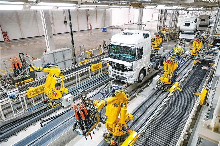 陜汽重卡擴(kuò)能項(xiàng)目總裝生產(chǎn)線,工業(yè)機(jī)器人正在進(jìn)行自動(dòng)化裝配作業(yè)。(資料照片) 記者 竇翊明 攝