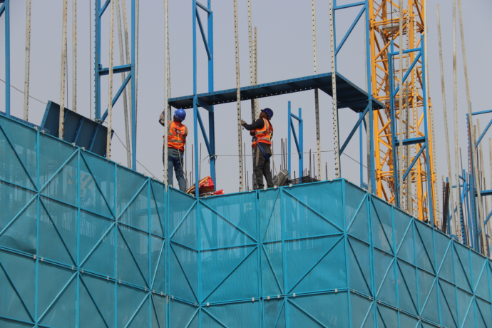 工人正在進行附著式升降腳手架安裝