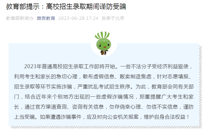 教育部還提醒,要提高防范意識,妥善保管好自己的身份證號、考生號等個人信息和志愿填報(bào)系統(tǒng)密碼等登錄信息,不要泄露給他人,防止志愿被他人篡改。(記者王鵬)