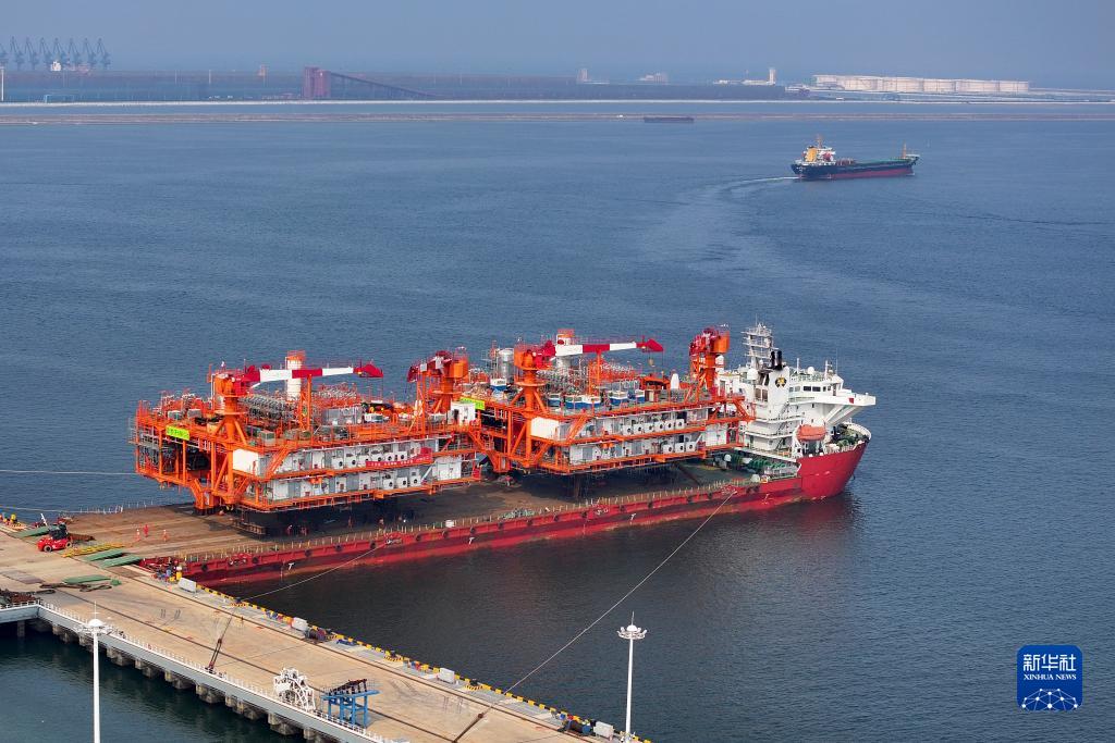 這是8月9日在天津?yàn)I海新區(qū)拍攝的渤中19-6凝析氣田I期開發(fā)項(xiàng)目組塊裝船作業(yè)現(xiàn)場(chǎng)。組塊裝船后將赴渤海西部海域,進(jìn)入海上安裝和聯(lián)調(diào)階段。新華社發(fā)(杜鵬輝攝)